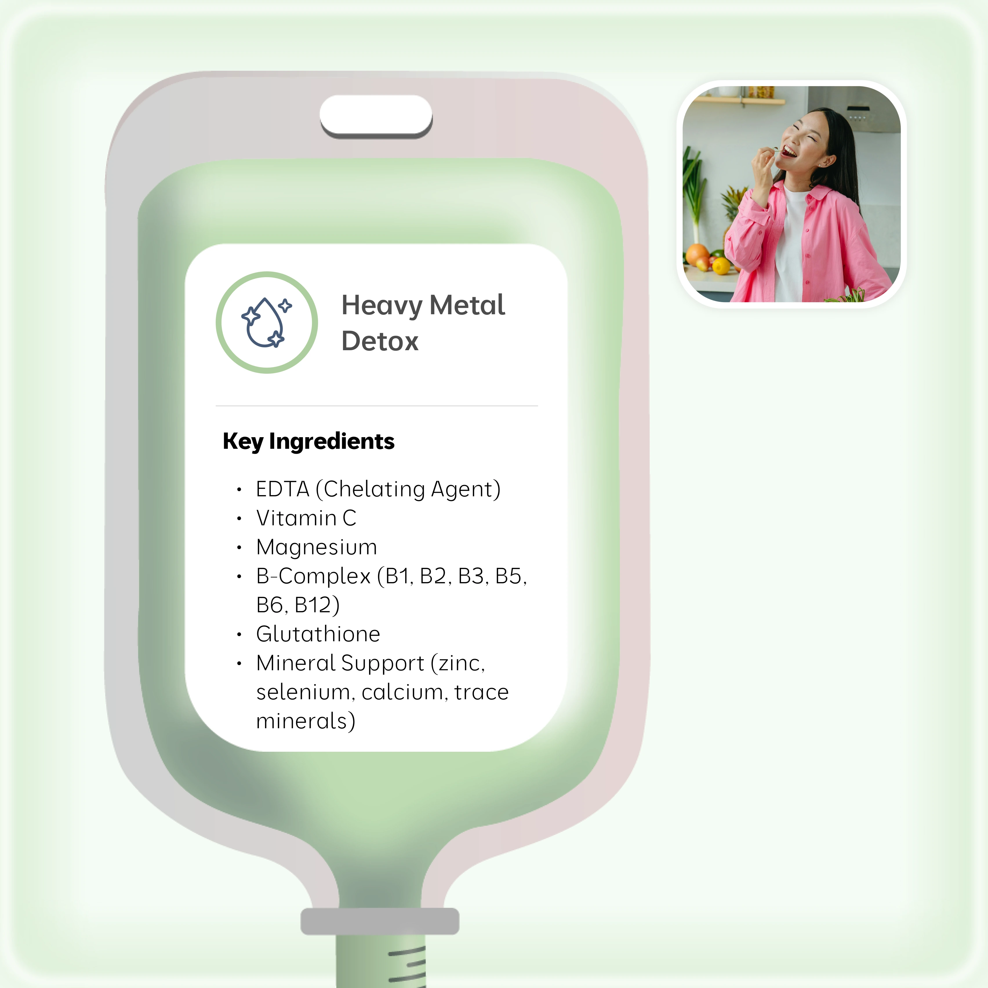 Chelation therapy with IV nutrient support helps remove toxic heavy metals (lead, mercury, arsenic, cadmium, aluminum) while replenishing essential vitamins and minerals for energy, brain, and heart health.